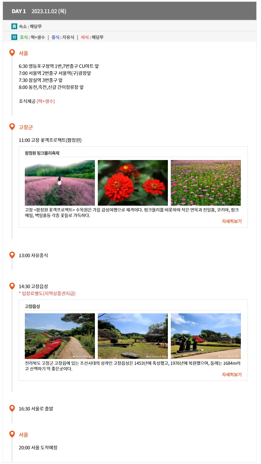 | 64,000원 | 왕복 교통비, 1식(조식) | 개인경비, 여행자 보험, 입장료 | 영등포구청역, 서울역, 잠실역 등 |
